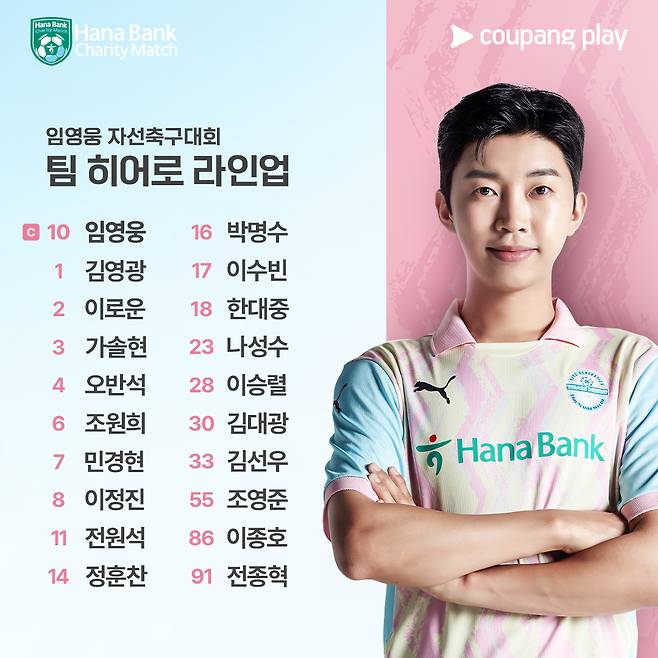 '팀 히어로'에는 임영웅이 이끄는 '리턴즈FC' 선수들을 중심으로 팀이 구성되며, 팀 기성용에는 최근 JTBC '뭉쳐야 찬다3'에서 놀라운 축구실력을 보인 가수 한승우를 비롯해 쇼트트랙 선수 곽윤기, 크리에이터 말왕 등이 출전합니다.